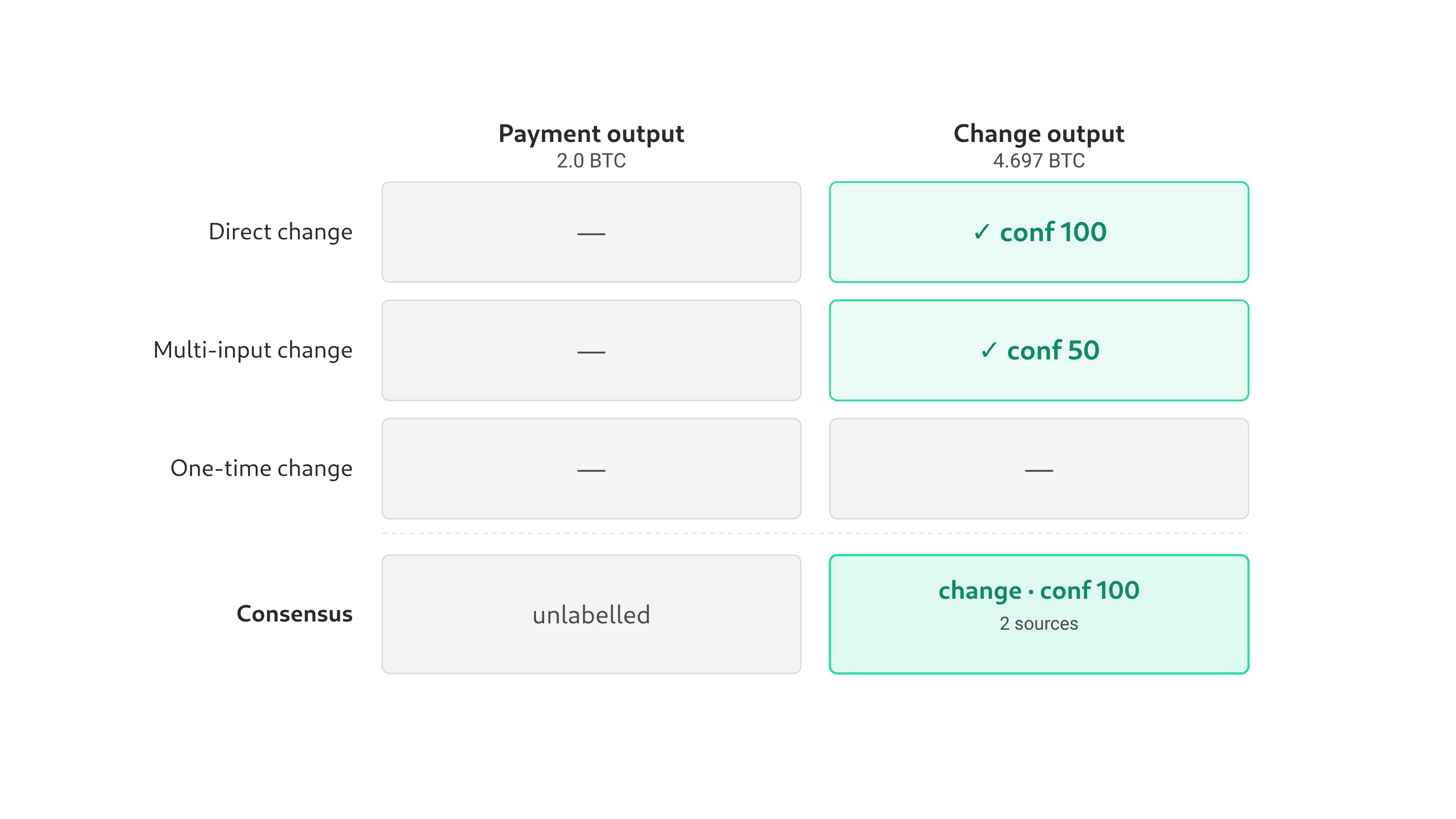 After the three checks run, their results merge per output address. Each entry in the consensus carries the union of source names and the highest confidence among any source that fired. An output that two checks agree on is not double-counted. It simply inherits the maximum confidence. The figure below shows this for a real transaction (fc12dfcb... from block 400,000): all three inputs come from the same address, which sends 2.0 BTC to a recipient and 4.697 BTC back to itself. Direct change fires at confidence 100 (address reuse) and multi-input change at confidence 50 (same cluster). One-time change stays silent because the address already has on-chain history. The consensus merges both into a single label at confidence 100 with 2 sources.