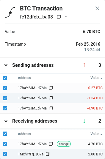 For investigators, the change label on any transaction immediately shows which output likely continues the sender's side of the story. Following a victim address forward through a suspect's wallet, the change labels allow skipping dead-end payment branches and focusing on the funds that stayed under the same control. The same labels feed into address clustering, making it possible to resolve dozens of transactions into a single entity without reading every one by hand.