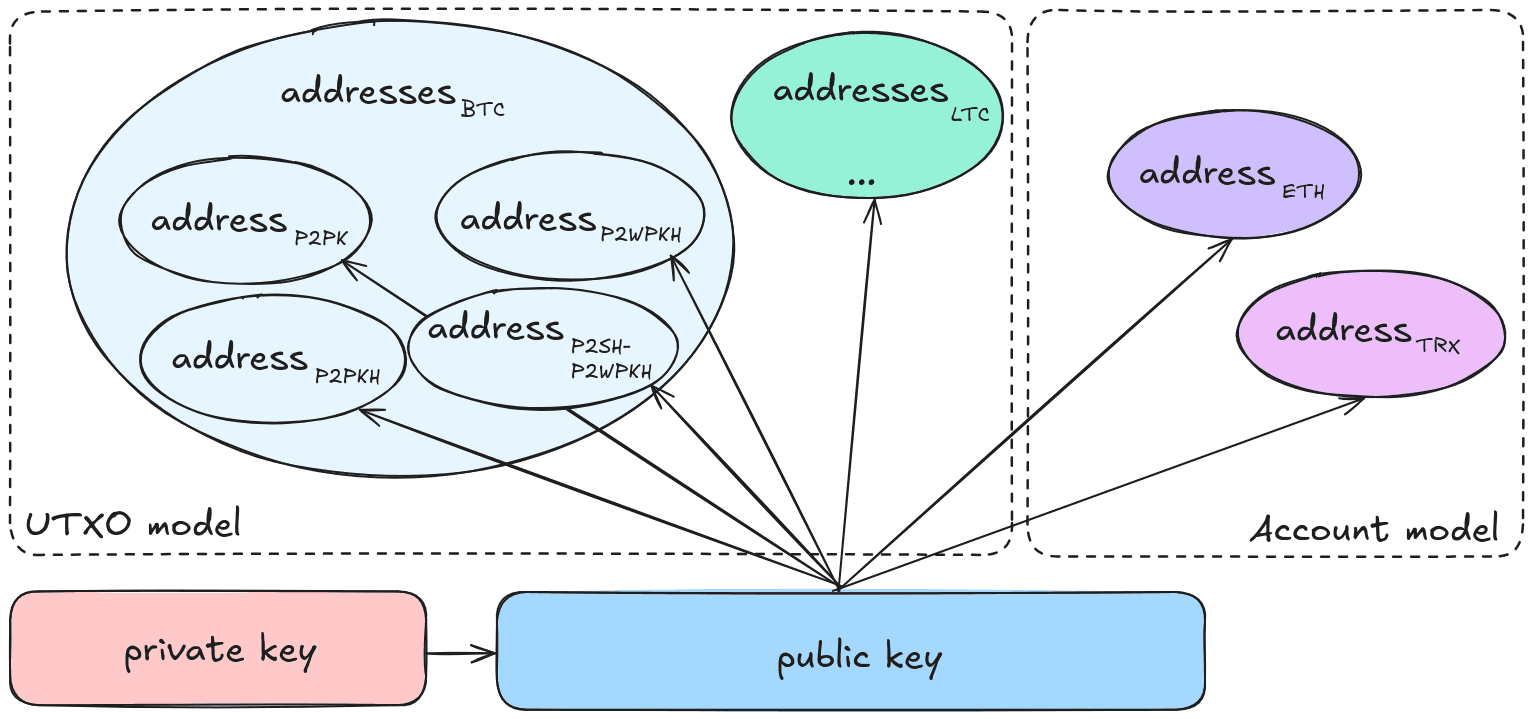However, the address formats of Bitcoin and Ethereum, the two most widely used blockchain designs, are not compatible at the address level, even though both rely on the same elliptic curve (secp256k1) and digital signature scheme (ECDSA). A Bitcoin P2PKH address is a Base58Check encoding of a RIPEMD-160(SHA-256(public key)) hash, while an Ethereum address is derived from a Keccak-256 hash of the same public key. The resulting strings share no visible similarity, yet they can be controlled by the same entity.