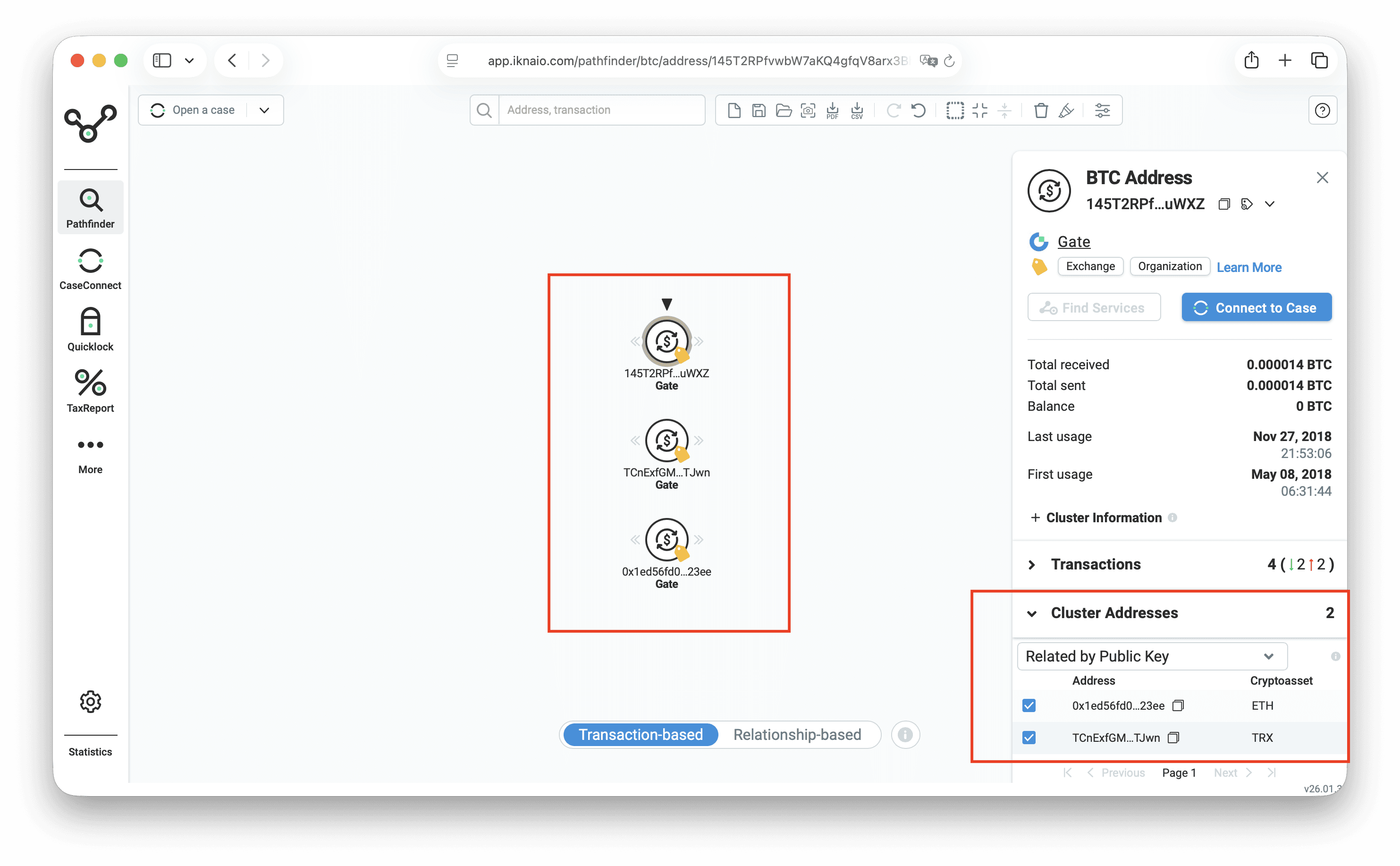 Investigative workflow integration. In Pathfinder, Iknaio's tracing interface, investigators can see cross-chain cluster information directly when examining an address. If an address on one network is linked to addresses on other networks via shared keys, these connections are surfaced automatically. This allows investigators to follow leads across chain boundaries without manual key extraction or format conversion.