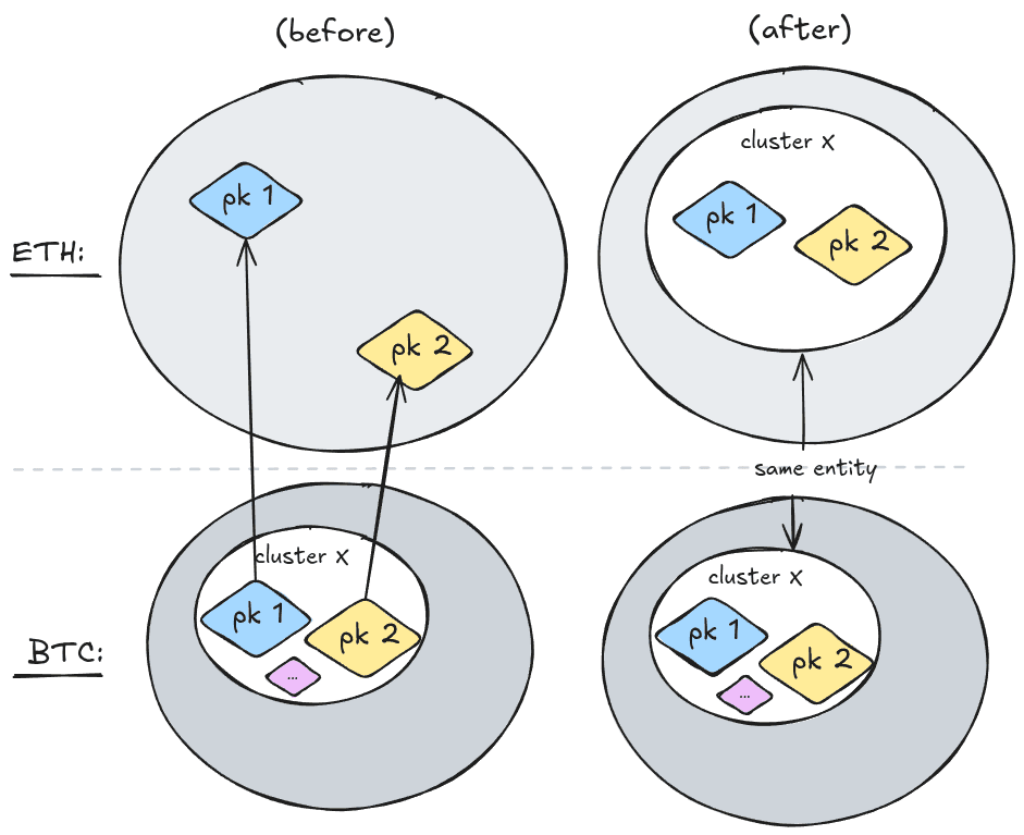 Transfer clustering information across chains: if a set of Bitcoin addresses has been grouped into a cluster via the multi-input heuristic, and one of the public keys in that cluster also maps to an Ethereum address, then that Ethereum address can be assigned to the same cluster.