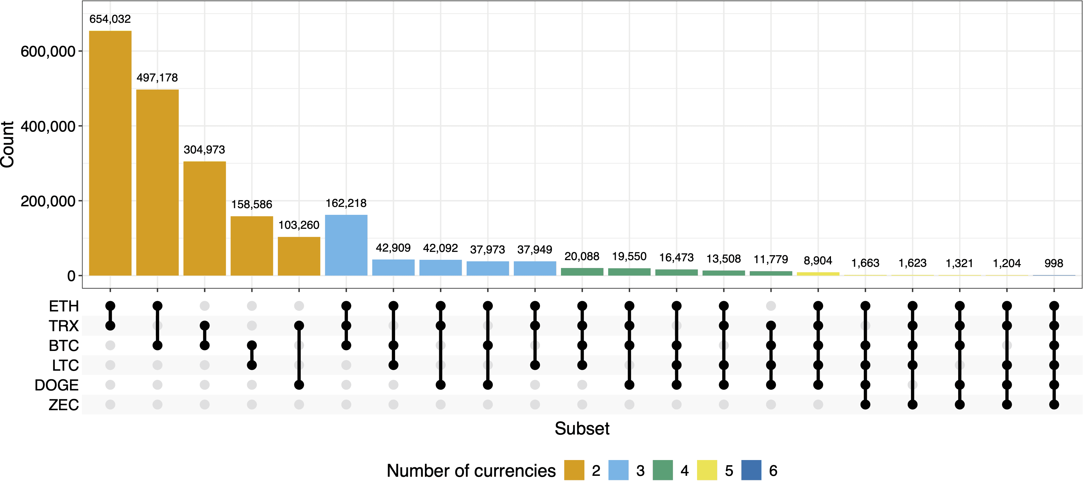 The most frequent overlaps occur among UTXO-based chains (Bitcoin, Litecoin, Dogecoin, Zcash), which is expected due to their shared codebase heritage. However, substantial reuse also occurs between UTXO and account-based systems, notably between Bitcoin and Ethereum — a pairing that prior address-matching methods could not detect.